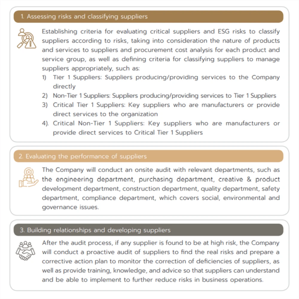 With the real estate development industry shifting toward a “low-carbon society,” driven by government policies, international regulations, and rising consumer expectations, the Company recognizes the need to manage risks within its supply chain, such as building materials, furniture, and construction contractors, to ensure that the Company and its business partners can operate sustainably together. The key approaches are as follows: