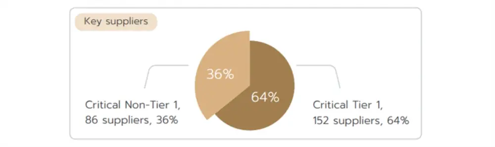 - Critical Tier 1 Suppliers: Suppliers that engage in direct business with the Company and have an annual purchase value of at least 5 million baht, accounting for 64% (152 suppliers) of total key suppliers.