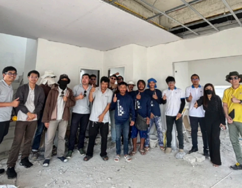 Training and demonstration of ceiling installation, wall skimming, painting, and tiling for partners and contractors to enhance skills and ensure construction work meets standards.